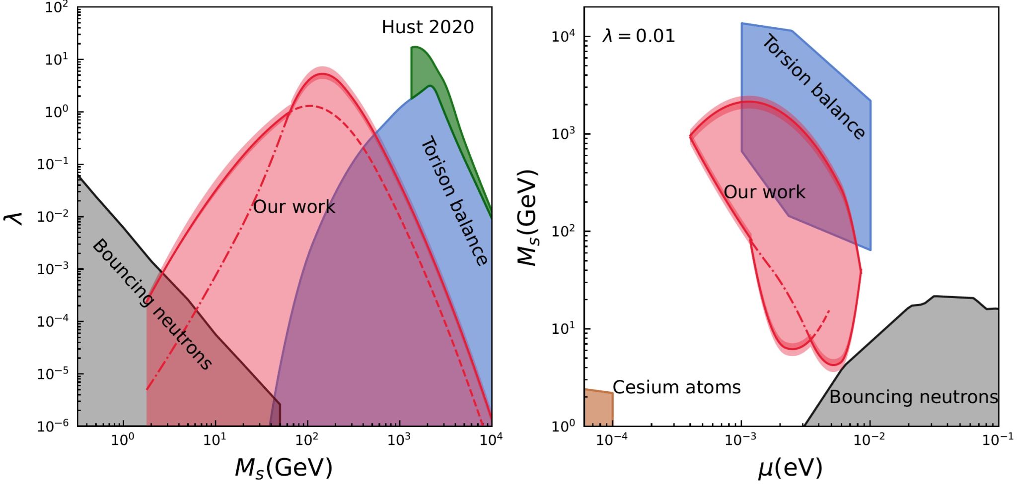 Figure 2. Dark energy detection results: The excluded parameter space for symmetron theories in the λ-Ms plane (left) and the Ms-μ (right). The colored regions represent parameter spaces that have been experimentally tested and excluded, with the red region indicating the results of this study.