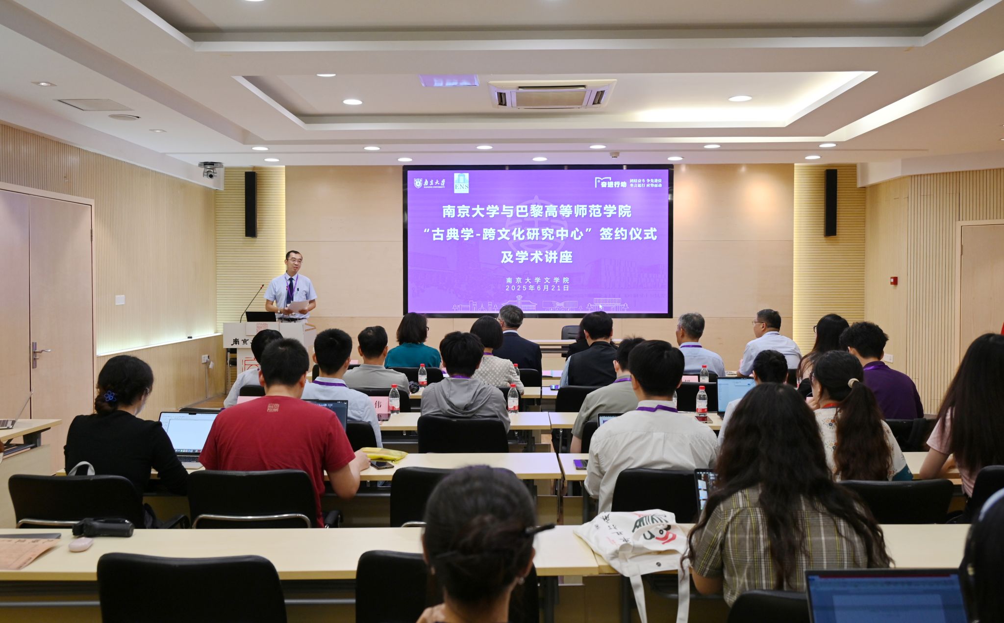 On June 21, the signing ceremony and academic lecture for the establishment of the "Classics and Cross-Cultural Studies Center" (Centre d'études classiques et transculturelles, NJU-ENS), jointly founded by Nanjing University and ?cole normale supérieure (ENS), were held in Nanjing. Professor Dong Xiao, Dean of the School of Liberal Arts at Nanjing University, and Professor Daniel Petit from the Department of Classics at ENS signed the cooperation agreement. Gao Fang, Director of the Office of Humanities and Social Sciences at Nanjing University, and Professor Daniel Petit jointly unveiled the plaque for the Center.